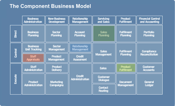 IBM's Component Business Model is a new way of looking at your business. It represents the entire business in a simple framework that fits on a single page. It is an evolution of traditional views of a business, such as business unit, function, geographic or process.