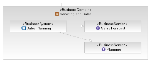 Having identified a set of business components/systems, we want to go on and define the services that these components provide (and depend upon). Again, this is described in some detail in Guideline: Business System, however it describes the provided/required functionality as "capabilities". So to recap let's look at an example; the figure below shows a business component/system which provides two distinct services, modeled as interfaces and realized by the component. This allows us to not only model the services, but if required to even model the business functions on each service. Modeling the dependencies between services in this way is reasonably straightforward and produces a structural model which is almost identical to the CBM map above.