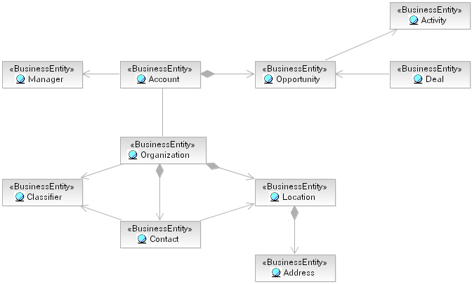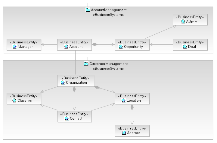 entity "Account" as the primary artifact owned by the "Account Management" Business System, and "Customer" as the
