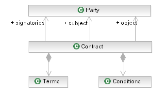 In the following class diagram we see the elements of a legal contract, identifying that the contract is between two or